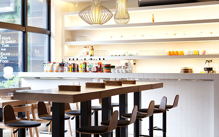环绕着绿意的植栽墙,共享着自然的阳光及生意,投射着柔和的光影故事在每一面桌缘、每一道餐点,或是共聚,或是独处,在包容性极强的空间内,容纳着城市不同的人与故事。