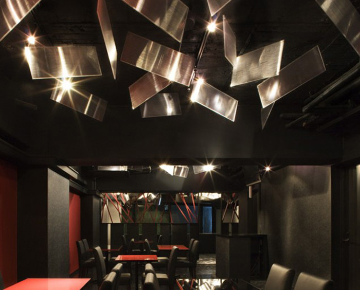 设计师在有限的素材当中,挑选了铝合金这样轻易能塑形的利落材料,经一折一叠成各种形状后,这些铝花瓣被布满了整片在上,尽管不提,也能窥见日本传统与生活态度完美地被呈现在空间之中。