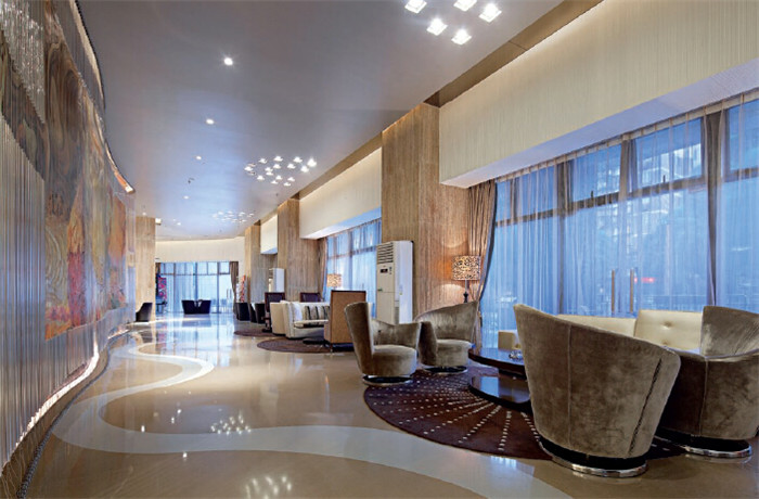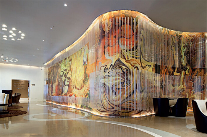 简洁、利索的切面与贯穿始终的竖线条盈于整个空间.使空间充满节奏与韵律。植物藤蔓的地面拼花与巨幅的墙面艺术壁画,恰似乐章间跳动的音符,蕴含着“中粮”的品牌内涵。