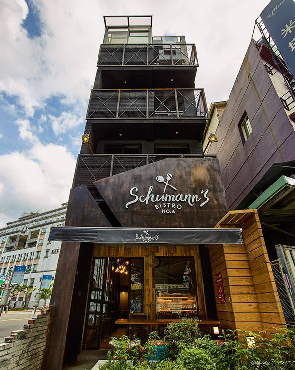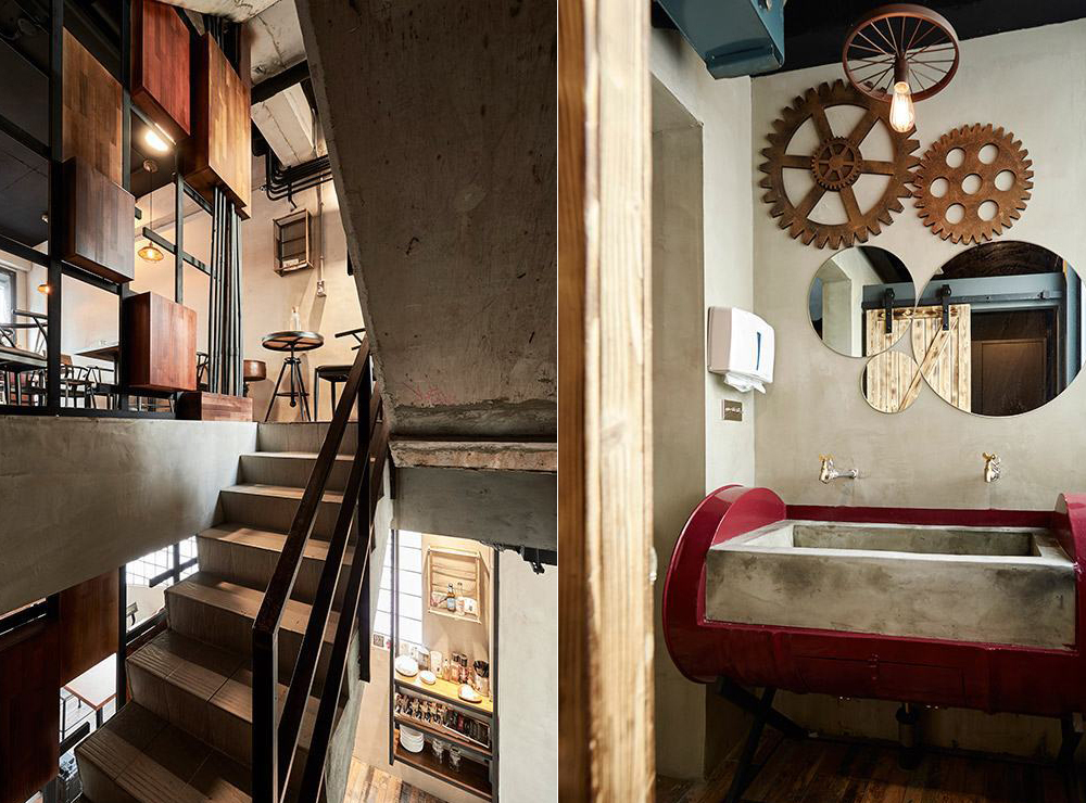 因每层楼的坪数有限,为避免空间感过于压迫,楼梯间的扶手与隔屏皆以穿透式手法呈现,不规则的铁件隔屏随意嵌入木柜,兼具场域界定与展示功能,替空间增添丰富的视觉变化。此外,主题餐厅设计师亦不忘利用楼梯间的畸零空间,作为风格展演的精彩段落,特别在梁柱漆上锈漆、壁面贴饰回收木,简单摆上酒瓶装饰,闲置的墙面立即成为风格十足的展示端景墙。
