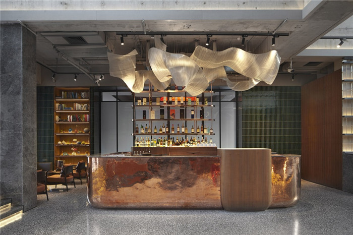 东方美学中,设计讲求和而不同。JE北京的清水混凝土外立面,内敛淡然,灯光的运用下,建筑的肌理显现,浑然散发先锋美术馆般的高级气场。楼梯的色彩是华夏的红,形意源自缎带,其上的灯光则如金丝线写意勾勒,挺立空间内,本身就是一件美学雕塑品。头顶的纱幔式样的玻璃灯具是曲线元素的延伸,以形意柔化空间,消解水泥与金属带来的刚性冷峻,契合用餐空间的氛围调度。