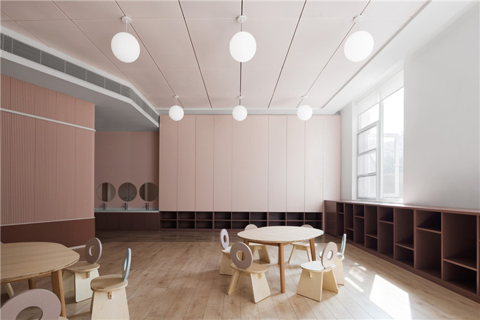 孩子在学习中领悟知识,体悟情感。幼儿园空间设计应强调高度的灵活性和互动性,空间不仅不能成为孩子交流的屏障,反而应成为促进孩子交流的工具。在原本乏味的狭长走道之中加入“口袋空间”之后,教室大门被“藏”了起来。寻找自己的教室便成为了孩子们初入学堂的第一课。与此同时,口袋空间使得走廊也变成了课外学习的理想场所。地面的水磨石分割线条则以跑道的形式呈现,鼓励孩子们在室内运动。所有墙体均采用圆弧倒角设计,以提供柔和的视觉体验并保证孩子们在运动过程中的安全。