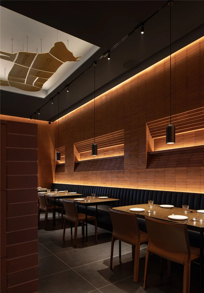 墙面上红砖的内凹处理,既避免了单一材质满铺的单调与呆板,增加了空间的层次,又可以将环境光暗藏其中,营造温馨的就餐氛围。