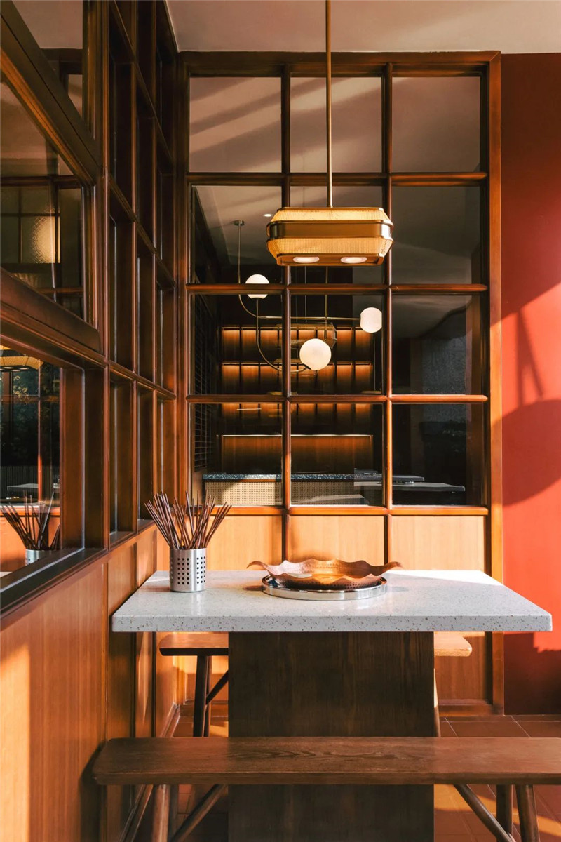 不同的空间区域满足不同食客的需求,户外通风效果好,也让室内空间不显逼仄,在每晚的夜灯下,那座无虚席的景象就是最好的门头招牌。整体空间选用低明度棕红色调的木纹贴膜,地面和部分墙面搭配同色系的红瓷砖,不同就餐域的地面以不同花纹的印花瓷砖做区隔。搭配金属藤编灯具、金属藤编屏风、植物花纹墙纸、布艺沙发、球形灯具、灯箱等,整体氛围复古又时髦,腔调十足。