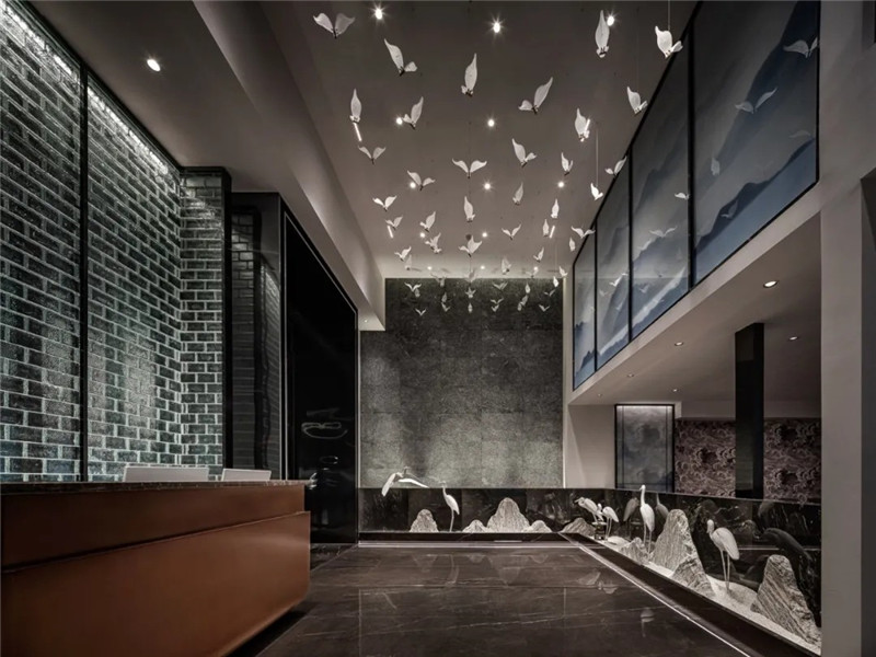 来到室内,也就到了海滩,悄然惊起的一滩白鹭,在天花上翩飞。中式矩形玻璃砖砌墙,沉稳大气;假山旁几只白鹭觅食,悠闲自在;若隐若现的水墨山水画,融入诗意;纹路细腻的文化石,拙朴内敛。