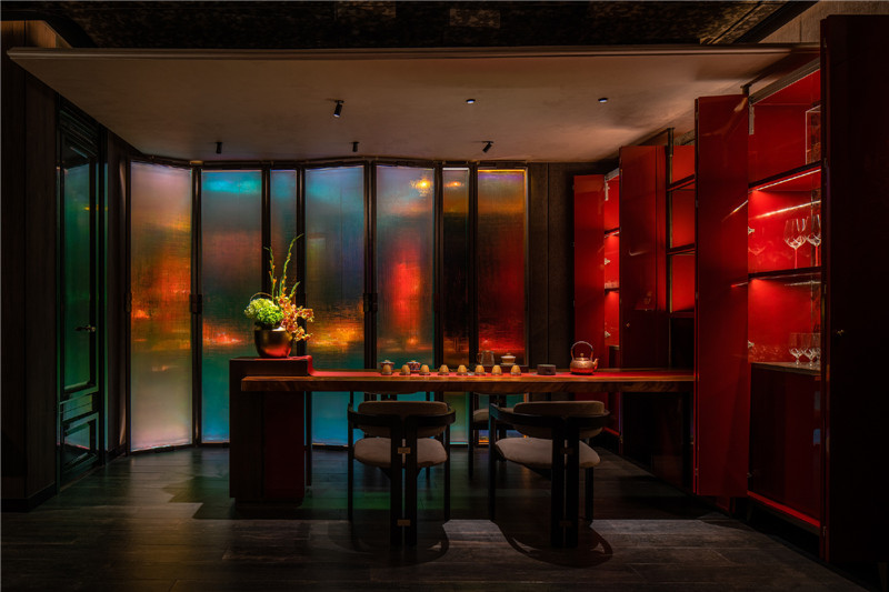 传统的黑,善于营造深沉的场域氛围;东方的红,则延续某种严肃的热烈;由感知牵引情绪,暖色光渲染墙面,渐延渐深;贯穿艺术化再创作思维。芙蓉,蜀锦传统的材质当代的设计,摆脱形态束缚追求意象的通感共鸣。熏,气味或烟气接触物体;构筑过程,寻找记忆、捕捉记忆,终创造记忆,思绪蔓延。