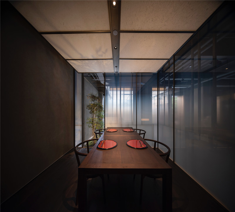在幽静的廊道中游走,宛如在京都巷弄里流连,一步一景,在顾盼、开合、动静、光影、草木之间,收获惊喜与感动。由石板汀步拾级而上进入包厢,以简约线条勾勒的灯盒悬于顶上,进一步延伸灯笼主题。木地板与榻榻米,肌理漆墙面,粗粝平滑与虚实构图间,呈现传统日式料理的风雅姿态。