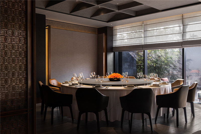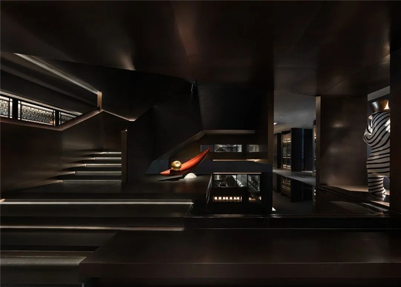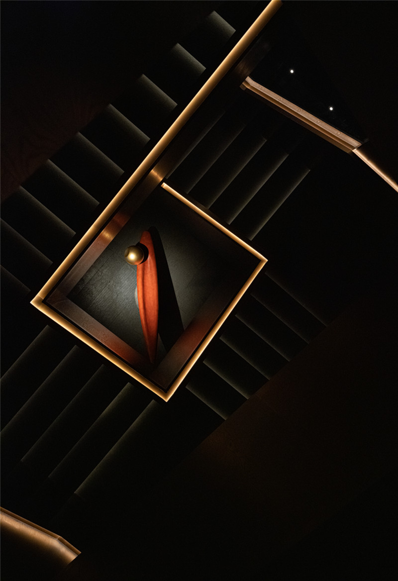 动线是建筑空间的灵魂,良好的动线设计是一种情境创造,餐饮位置布局围绕餐厅展示区域,邻靠窗边,观赏龙湖美景的同时,人可以在室内空间中连续位移而产生的时间因素,使空间成为流通的动态时空,感受格调高雅的空间氛围。起承转合,楼梯处于餐厅较为中央的位置,紧邻明厨和散台,作为联结上下的通道,在暗色环境中尤为突出,就像一个中枢视觉点,既丰富了空间层次,在不同层面都可通过楼梯观赏,又弥补了空间过度的空隙,弱化固有的空间感。转折而开阔,一叶泛舟自成一景,彰显一派大气风范。
