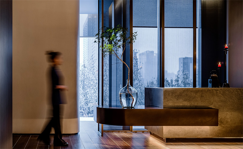 设计之初,就遇到了一个难题,餐厅一共有三个客用入口,三个高差。那么人流动线的问题怎么解决?高差问题如何解决?设计师实地考察了晓长安客人使用频率最高的入口以及不同入口的客人类型。最终选择在人流量最大的电梯间放置服务台,对其他入口进行了简洁的装饰。每个入口都设有功能区域,确保进入餐厅的客人能在第一时间得到餐厅服务人员的引导。