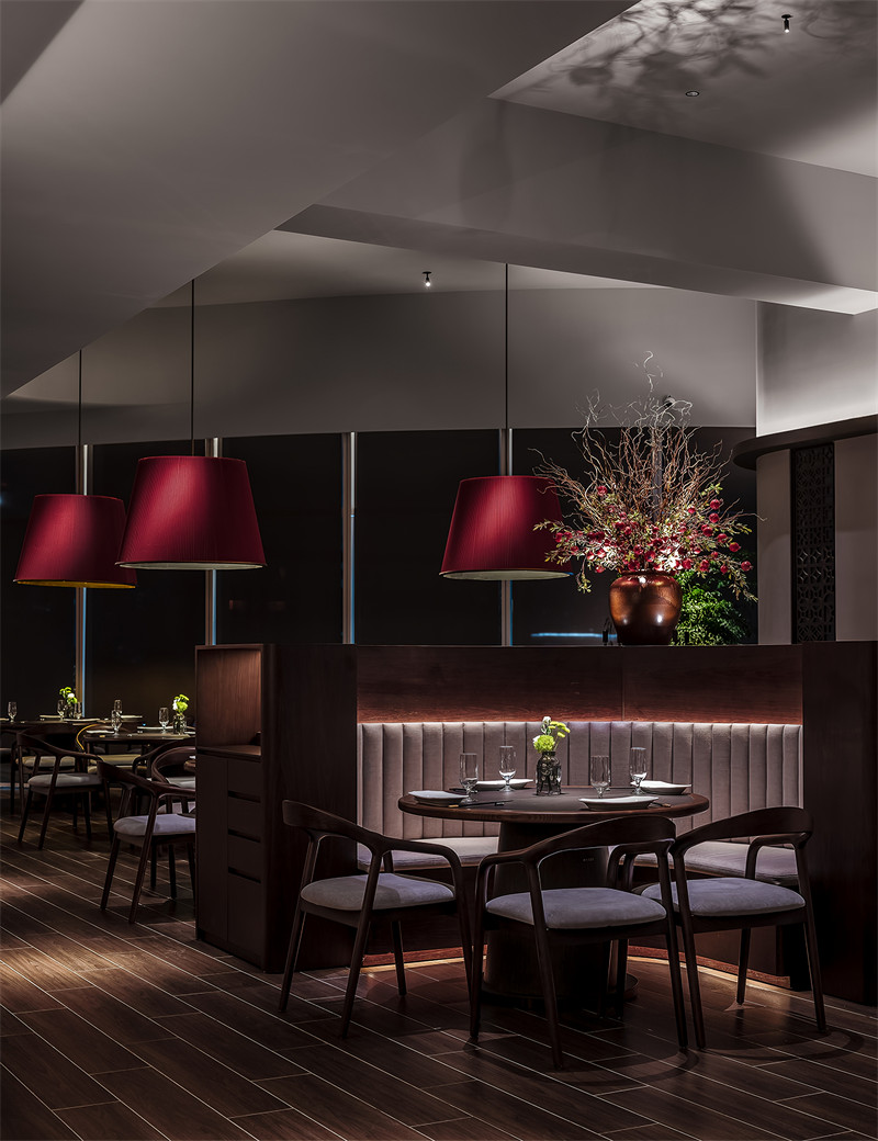 走廊的设计有起起伏伏的视觉效应,空间有虚实的变化。搭配上深色木面的墙裙以及灯带,使得深长的走廊有一定的看点,不会枯燥。几盏让人印象深刻的大红灯笼,“中式老家具”结合现代抽象艺术绘画的和谐,回忆中“烟火气”的场景。