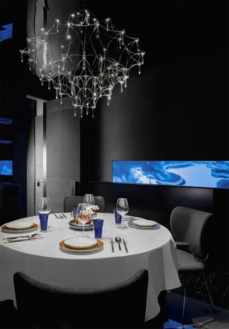 “疑似水仙梳洗处,一螺青黛镜中心。” 步入大厅,湖光黛影云烟的巨型当代观幕,缔造幻、峦、造、境,如梦如幻。美物、美器、艺术,空间里独特的艺术装置与器物选择,呈现出美学与美食的文化连接与当代表达。