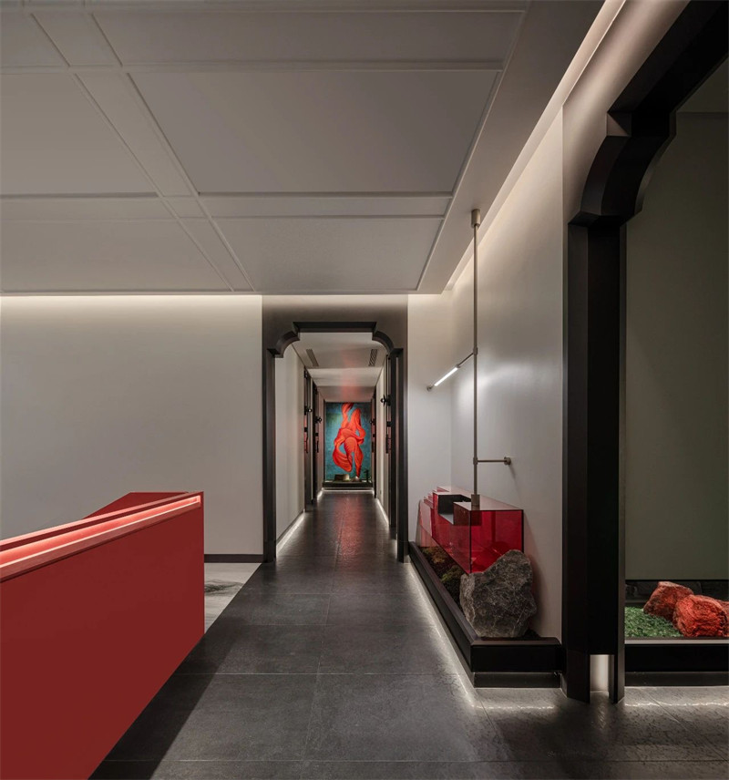 自然山水与文人笔墨看似二者关系分明,是迥异的两种所指,但实则密不可分。上下连接的动线核心,垂直楼梯除了功能性需求,同样具有美学性和意境性的语义表达。蘸墨、落笔、游走、收笔,一气呵成的笔墨手法通过楼梯的圆润形体转译出来,而具有冲击力的红色又很好地营造了喜庆、热闹的火辣氛围。