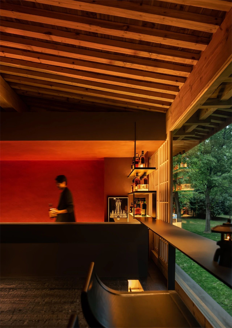 如院创始人傅月良先生的菜品手稿,刘荣禄先生认为是最好的空间装饰品,选取跟墙面相同的材质,用镭射手法复刻,低调又高级。建筑是凝固的空间音符,是联系内室外景之间的介质。这里有餐食,有可盘坐的茶屋,还有特设的威士忌吧,云窗雾阁,层层画意之上,与友人共坐,可观远处的山峦、苍木、奇石,在时隐时现的空间变换中,寻找别业禅心。