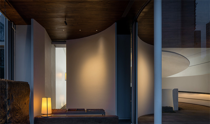 作为独立的入口门厅,是创造代入感的关键,将繁杂化为造景,并通过漫步式的游园动线,将一个简单的进入方式,演绎出步入春天的仪式感。空间内巨大的圆形伞状顶面,是在诠释中国廊亭的意象,同时引入粉墙的色系制造进一步的纯粹,安静、诗意的春天由此打开。