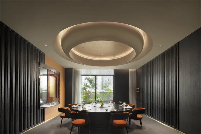 餐厅设计师还通过弧形吊顶巧妙解决部分空间层高受限的难题,再以浅色墙漆调节室内光线,光影漫漫、觥筹交错。在传统文化复兴的当下,以茶会友逐渐成为社交礼仪。部分包厢设立茶台,并以磨砂玻璃隔离外界喧嚣,营造清幽雅境,茶香丝丝扣人心弦,与友人共赏岁月的静与美。用设计为品牌赋能,以空间礼序相迎,以文化之美共鸣,无限的故事,于此相交、相聚。