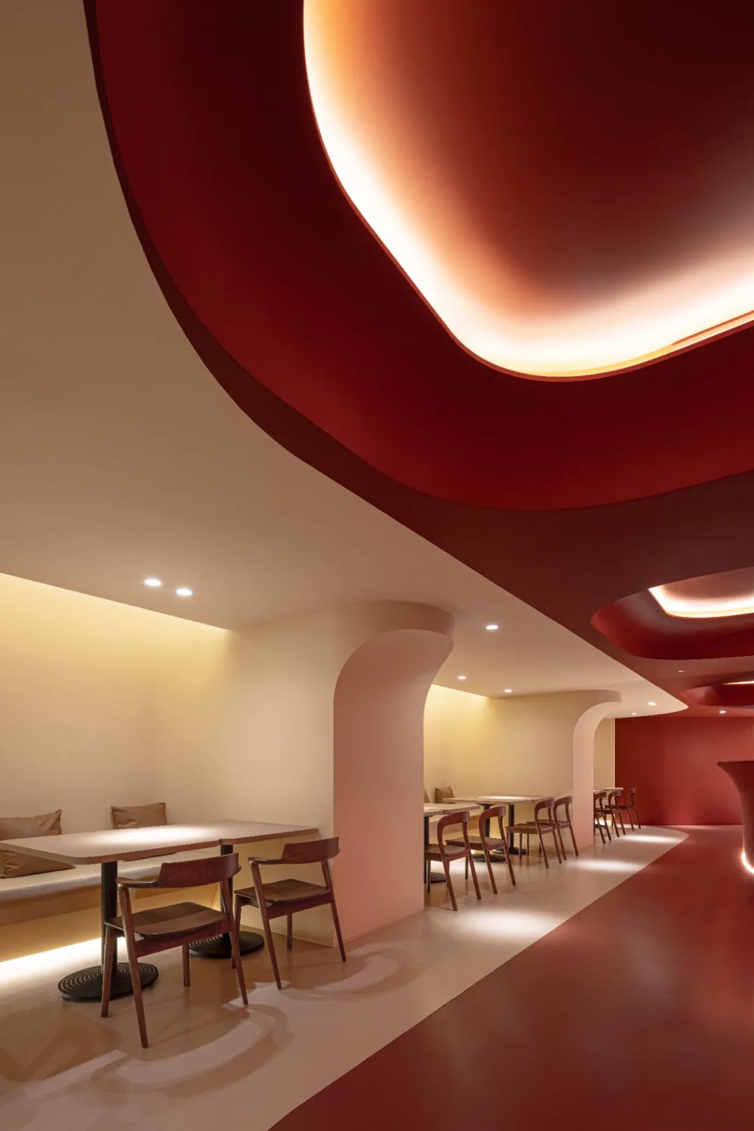 在座位区利用饱和的橘红色搭配上纯净的米白色,从天花顺应着弧线至墙面,一路延伸至地面将空间区分开来。两种色彩及光线的对比,为空间创造出更丰富但又和谐的调性。