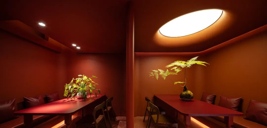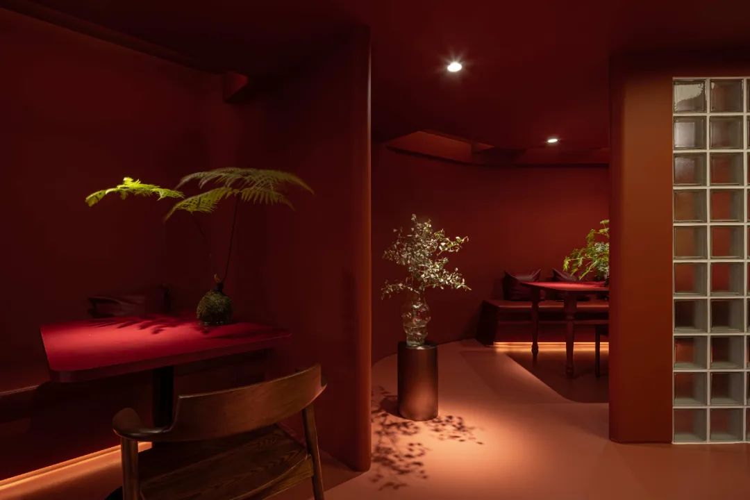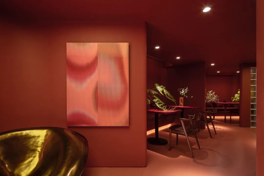 在热闹的都市中创造一处隐密如洞穴般的空间,让人沉浸於与世隔绝及美食的飨宴中,搭配鲜艳饱和的珊瑚红作为主要材料,为整体餐厅带来了强烈丰富的神秘感。