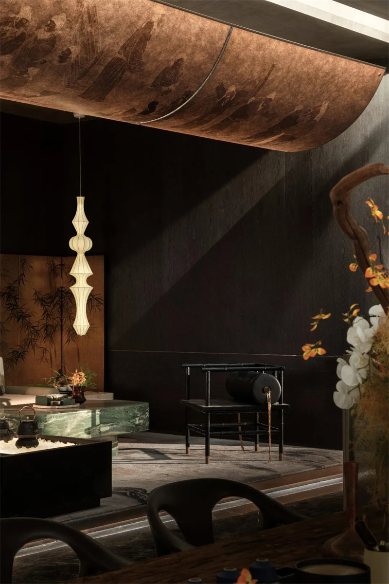以墨色、本色和青绿色为空间主色调,呈现出浓郁的宋韵之美。其中,吧台顶部的发光装置是一大设计亮点。该装置将宋代名画《春宴图》以无锡【留青竹刻】的工艺形式转译在弧形发光导板上,通过现代的装饰手法致敬非遗文化和宋式美学,实现了今人与古人的心灵对话。