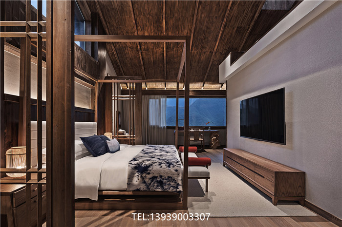 一层客房空间宽敞,室内家具尽量简洁,但功能完善,按观景、饮茶、卧室、阅读的生活方式划分空间形态。每间客房内都有大小形态各异的窗子,融山聚水,好似一幅横轴风景画。远山翠绿中,炊烟灯火,鸡犬相闻。一步入室,一步入景。窗下老木头的高台和茶桌高低错落的陈列,带着一种时光沉淀的静气,在此可听风可看雨,也可挥墨泼毫,静观赏读,都不失为一种惬意。家具使用当地回收的老榆木制作,经过再切割和细细打磨,每一根木头的纹理都带着时光的气息。这是对返璞归真最直接的解读。