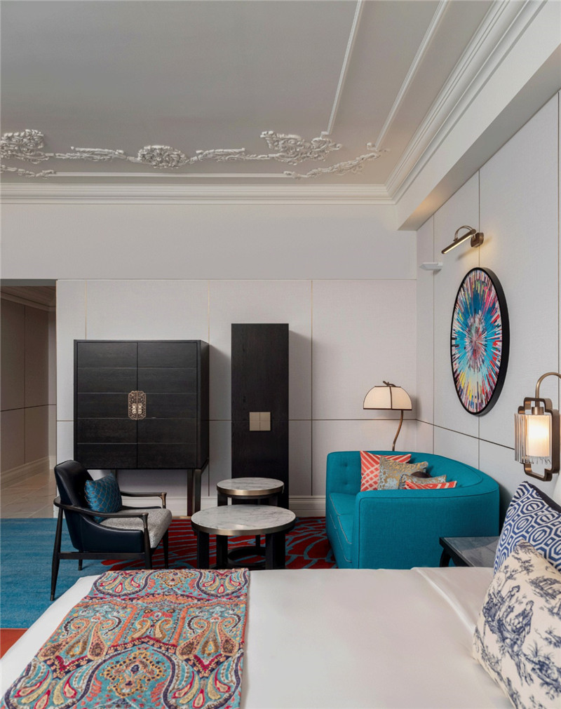 房间内走廊客房设计定下统一的设计基调:即色彩丰富的地面肌理和简洁的空间立面,仿佛寓意着脚踩丰富的历史,而未来可期。客房会客区以不同蓝色铺就的空间中,暖色的软装在其中自由跳跃,平衡整体色彩。