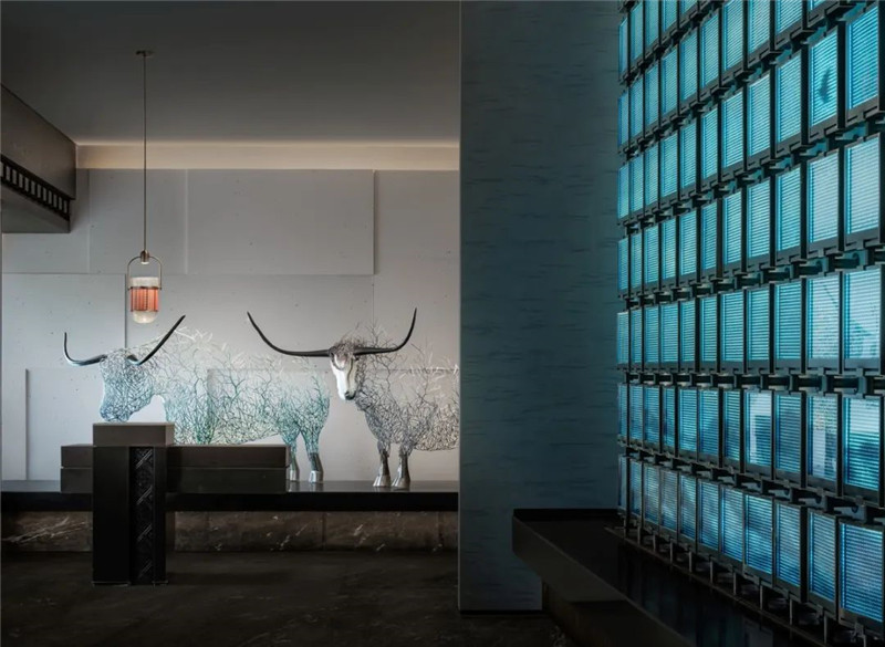 牦牛、神鹰等艺术品是当地典型文化元素的体现,具有不可替代的民族内聚力和认同感。酒店的前台隐藏在大火炉的右后侧,背景玻璃板上的神鹰翅膀,寥寥几笔着墨,却意境高深。
