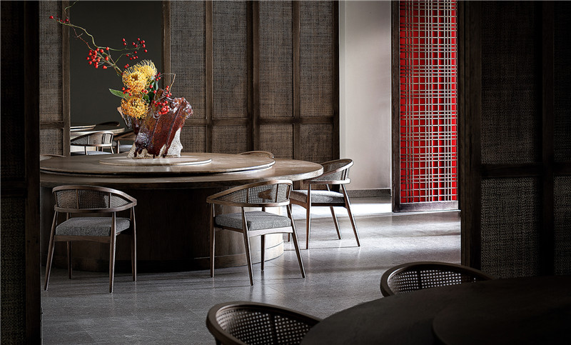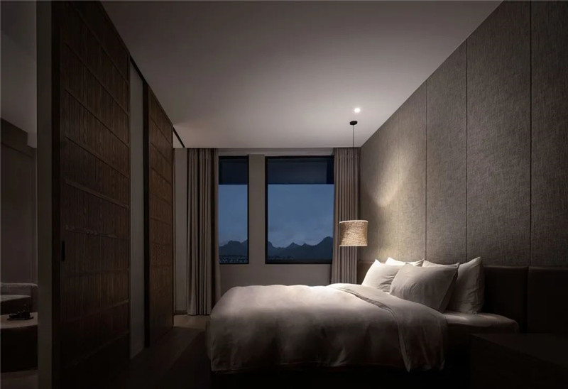 从古取意,融今之美,酒店设计师发现文化与自然的形式之美、轮廓之韵,自黄山的朝霞里攫取了一抹红调,与木门构件衔接,增加浓淡对比和室内透光的同时,消弭木艺带来的时空凝滞气息,升华旅居生活的悠闲自在之感。