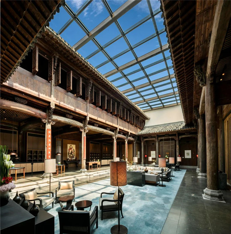 酒店大堂原为明代徽派古建“江南第一官厅”的五凤楼。作为旧时宗祠仪门的常见制式,历来以巧夺天工闻名于世,五对翼角如凤凰展翅,气势恢宏,旷古罕见,在增添祠堂威仪之余,寄寓宗族人才辈出含义。该楼前五后七开间,三进两天井,占地面积约1400平方米,门宽近4.5米,廊高约10米,可容纳上百人雅聚,高大巍峨,建造工艺极其复杂,耗资巨大,传世珍稀。