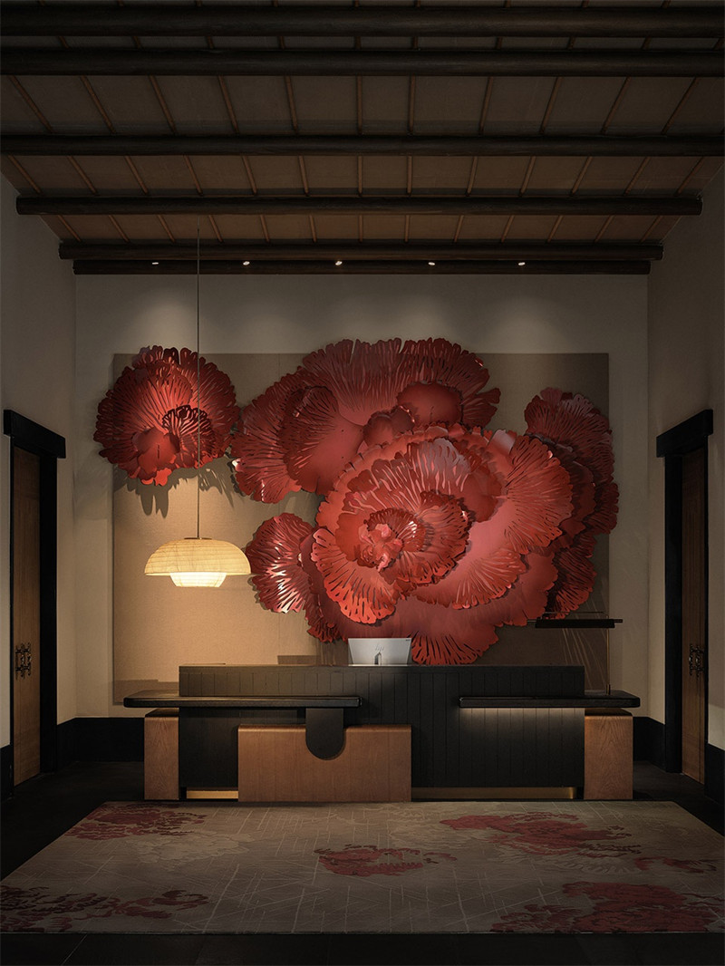“四十里城花作郭,芙蓉围绕几千株。”往昔蜀国地,繁华锦官城。接待处背景层迭编织出的木芙蓉,优雅绽放,缱绻温婉。“红”色系取自“晓看红湿处”,它如枯木逢春一般的生长,表达了对生活的期许与热爱。