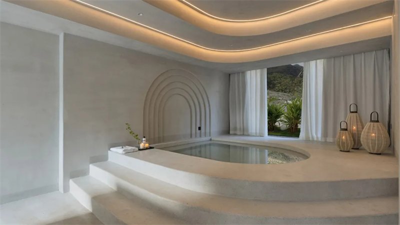 在这里,温泉酒店设计公司营造出了一种完全区别于普通温泉酒店的全新体验方式;建筑的部分空间被埋在山体中。大部分的室内温泉泡池都位于地下空间,顺着建筑功能流线一步步往里深入体验天然温泉的过程同时也是走进大地深处感受自然温暖的一种体验。