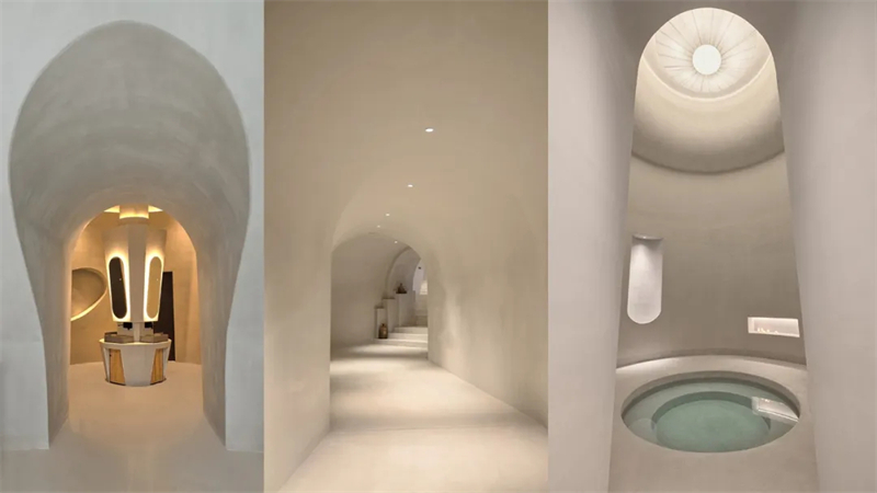 在这样的建筑空间中感受那种传自大地深处的温度显得格外贴切和舒适,地下大泡池顶部有天井直通室外,在雪花飘扬的冬季,泡着温泉欣赏雪花飘落的情景是一件非常惬意且富有诗意的绝妙体验。