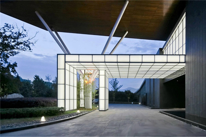 从客人乘车或是步行进入酒店区域一直到进入酒店大堂,酒店的景观,室内和建筑空间不断带给客人感官上的刺激。设计师认为酒店设计是从区域入口就开始的,而不仅仅局限于是酒店主楼本身,强调三者的整体设计。在嘉荷精品酒店的入口序列设计中,设计师从景观上寻找“曲径通幽”的感觉,在空间塑造中采用欲扬先抑,收放转换的方式,使得客人从一进入酒店区域就有不一样的体验。