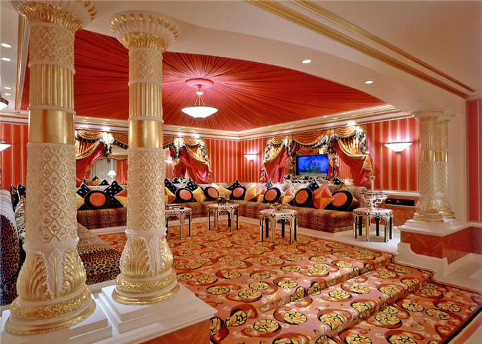 它拥有202套复式客房、200米高的可以俯瞰迪拜全城的餐厅。它的中庭是金灿灿的,它的最豪华的780平方米的总统套房更是华丽非凡,在第25层,家具是镀金的。最出名的莫过于“黄金屋”大厅、中庭、套房、浴室……任何地方都是金灿灿的,连门把手、水龙头、烟灰缸、衣帽钩,甚至一张便条纸,都镀满了黄金。虽说只是薄薄的一层,却超出了客人的想像力,很多大人物都眼前一亮、受宠若惊。已故时装设计师范思哲先生是见过大世面的人,他居然也被伯瓷的奢华给震住了,安睡一夜之后,他极为受用,逢人便会赞叹不已。