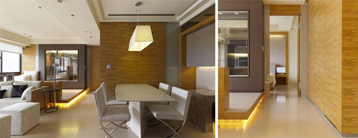 设计师的品味设计中总不忘落下一点专属他的独特气息,异于多数人使用隔墙、质材为区域划分界限之方法,他扬起区块的高度,并加入温润黄色隐灯,为简约规划设计中摆入视觉焦点,并以镜面反射扩大其空间,虚实之间呈递品味超凡的缪思设计力。