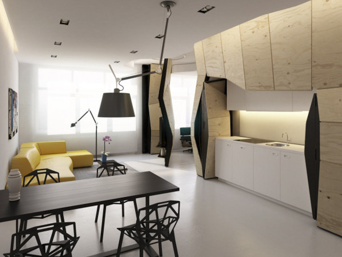 文章导读:60平方米(约645平方英尺),俄罗斯设计师弗拉德米申设计的小豪宅中中包含几个要素。该住宅是由黑色的金属框架和胶合板,这其中隐藏了各种生活的机能,分离且利落的分割出多墙面结构体。在非常小的空间里,兼顾了机能以及日常生活的空间。