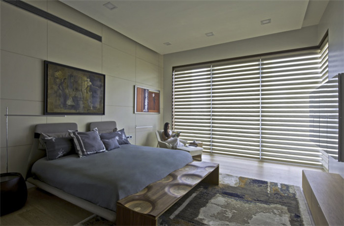 卧室这个地方,天花板上是一个重要的元素,它巧妙地照亮的区域,它产生的运动响应,形成了结构,即框架梁,设计师已经采取了空间优势横梁之间以获得最大可能的高度。