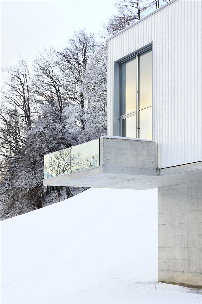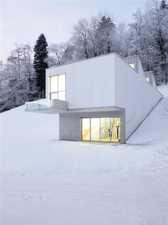 主建筑体量和天窗都是三角形的,所以在山腰上显得很显眼,工作室也有了独特的轮廓。设计师使用工业表面材料、建筑体量和白色的色调来合理的模仿工作室周围的住宅建筑和圣加伦区被雪覆盖的风景。