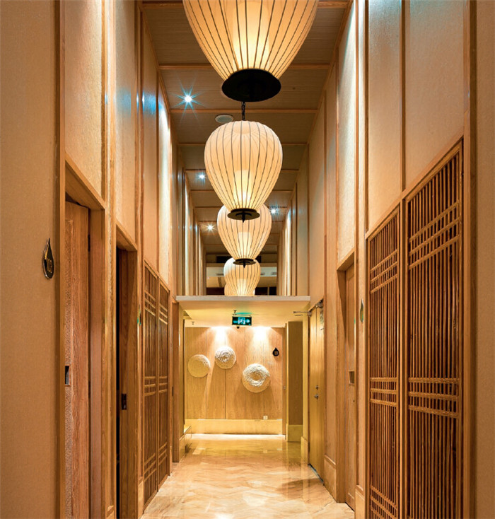 在元素的演绎上,墙体极具浮雕感的水波既为形式上的当代化表现,又鲜明地暗示着“水”这一主题意象;苇帘、水墨的绢纱、飘渺的古典山水挂帘,不仅平添了空间的文化气质,又在材质与形式上丰富了视觉与心理感受,营造出一个净爽、淡雅的休闲空间。