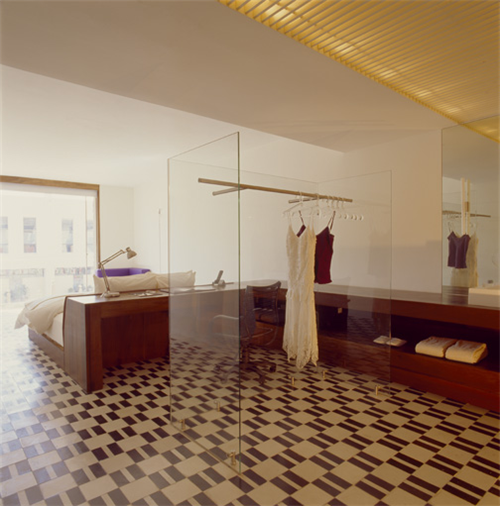 每一层的侧面都有一个巨大的L形庭院:一层用它来做客厅,这里是酒吧餐厅和接待室的延伸;二层和三层是客房延伸出来的空地;四层是娱乐区。天台由顶棚覆盖。古旧的建筑表面由石膏和石头砌成。本案精品酒店设计的主要材料是:石头(取材于原建筑)、旧木材与现代材料玻璃和不锈钢的结合。客房卧室和厕所分别使用瓷砖和缟玛瑙地面。