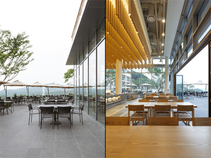 覆满整个天花板的竖直雕塑象征着麦田,在和谐的固体装饰材料和灯光照耀下,这样的餐厅设计唤起了一种非同一般的感觉。建筑、景观和室内设计,与外面的自然景色完全融为了一个整体。