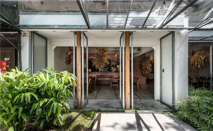 设计师在户外用餐区引入丛林气息,栽种多样树种,屋顶遮光罩则加入三角造型,融合了传统四合院的鲜明特色,运用透空的视觉处理,将自然采光纳为装饰一部分,营造出人与自然的互动连结;同时将植物元素延续入室内,透过干燥花妆点形式传递艺术氛围,并规划整排落地旋折门,以清玻拼接磨砂玻璃,加入仿旧的门框设计,将当代与复古作出完好揉合。
