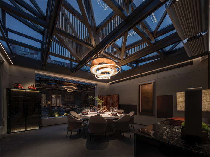 加建进而形成庭院前、中、后三部分,室内、建筑与自然在相互界定中融会贯通,形成一个可以相互渗透的空间结构。动线回环,建筑终于“活”起来了。宏大的格局观,往往来自高挑空空间,流畅气韵呼应窗外的园林,令人心旷神怡。以照明再次强化玻璃屋顶结构,苍穹、宇宙、时空、人、时间,都融汇在流光溢彩的现代建筑之中,复活的老建筑有了精神和思想。