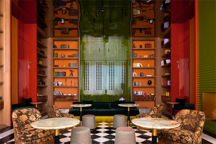夕阳穿过轻纱幔影流入室内,在墙面肌理上留下俏皮印记。黑白格石材地面、青缎面沙发、斑斓组合画和彩虹挂毯毛边围成的镜子趣意相连,塑造出艺术之家的自在惬意。红与绿的饱和度经降低处理做成亮光漆面质感,橙色肌理漆于二者间过渡,削弱了视觉上的强烈对比。黑白棋格的地面之上,古典的布艺沙发、大理石圆桌、墨绿丝绒的长凳,以及各种器皿、金属摆件,一应摆放出精致、和谐的生活格调,渲染出色彩碰撞、材质对比、古今结合的魅力。