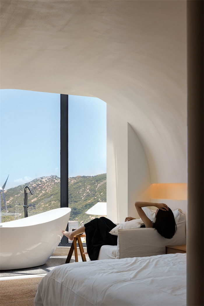 构筑最大的开窗尺幅,展现海景入画的意趣,层层递推的弧形轮廓赋予了窗景二次新生,升华了景观艺术。打造多层次地台,谱写结构韵律,嵌入大型浴缸,抒发悠然之意。底色与布局的留白,烘托了陶罐、草编地垫、木桌等物品的治愈力。
