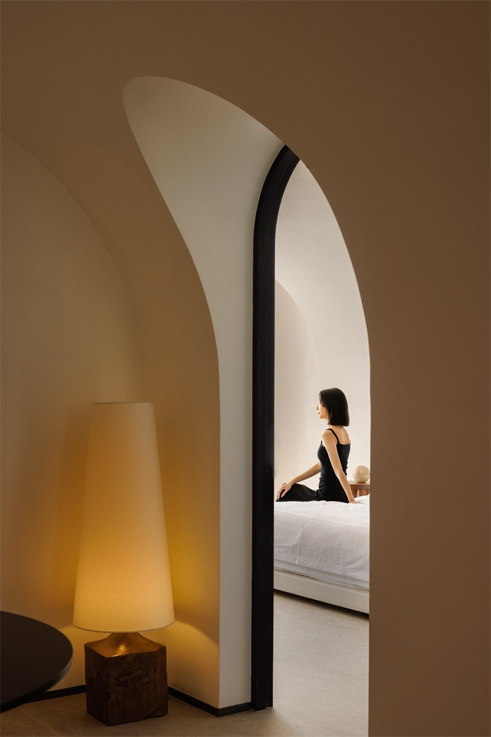 泡澡区和睡眠区不设任何阻隔,保持地面的平稳感与互通性,以墙壁联合天花的造型,拟态翻涌海浪的画面。大于常人体型的“海浪”结构,建设出置身浪中的奇妙体验。对标功能区位,增加暖光,既构成互动情态,又调和了冷暖气氛。