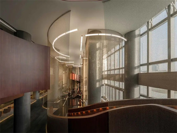 客人可通过两个穿插在金属网屏风之间的弧形楼梯,从2楼达到1楼,进入酒吧和展览区。展品陈列在平台的基座上,屏风起到一个帷幕的作用,既策展了展品,同时也为客人提供了坐席。