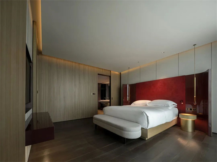 在通往客房的旅程中,设计师通过对照明强度的调整,为客人营造一种宁静和宽松的氛围。每个客房门口都有一个嵌入壁龛,透出的单一灯光用于引导方向。房间内部采光充足,有良好的通风设施,使用比公共区域更深沉的颜色作为床头、门和灯具的亮点。