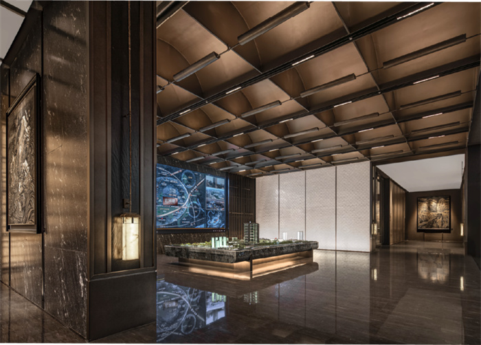 电梯厅内艺术版画《河山观云》的点睛之置,通过古铜配色与温暖光影凸显怀旧的质感,重新演绎穿透历史、纵横自如的山水美感。沙盘区以方正的结构呈现,坐落有序,宽阔硬朗。凹凸的石材肌理,散落的斑驳光影,传递着天地均衡的美感。