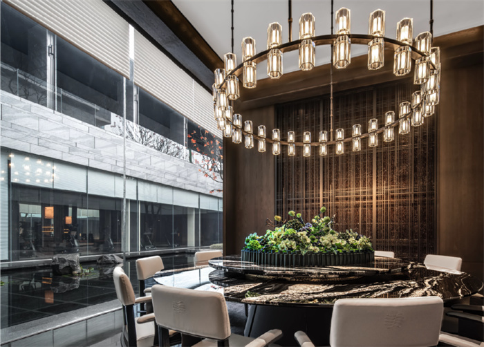 私宴空间配备私密接待室,能够满足多功能需求的交谈方式,温润诗意的东方格调渗透于空间的每一处,尽显宁静舒适而又稳重的雅韵,给予极高的生活尊崇体验。相较于洽谈区公共、敞开的特性,私宴区打造更私密和更具备个人喜好的场景模式,桌上悬挂的水晶吊灯,与桌面的花艺作品共同构成一幅和谐的画面。花艺作品源于爱马仕御用花艺师徐秋,还原自然之美,生命的力量得到了最鲜活的呈现。