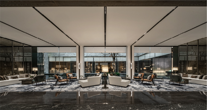 洽谈区布局开放包容,步至其间,自由随行。以座椅和沙发组合的形式充分利用空间,还原出一幅群山环抱、骚客围坐的雅集场景。云石落地灯顺势而下,云河纹理的软装细节,有序而自然,几何结构交相叠映,以便引导自在的东方意境缓缓沉淀。