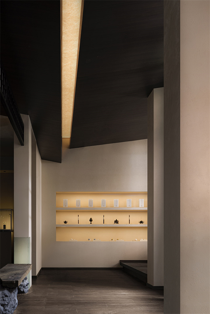 推开黑漆大门,门环碰撞大门的声音回荡在天井。穿过天井,步入室内,一道“天光”将一楼空间分为两部分。原本分居四角的四间厢房,设计师采用屋檐的形式将它们分隔成前后两部分。屋檐下,加入中式建筑中的的木构柱,形成“廊”。廊模糊了室内外的边界,廊下信步,用游园的方式营造动线,自然的串联起品香、茶道、及珠宝博物馆区域。